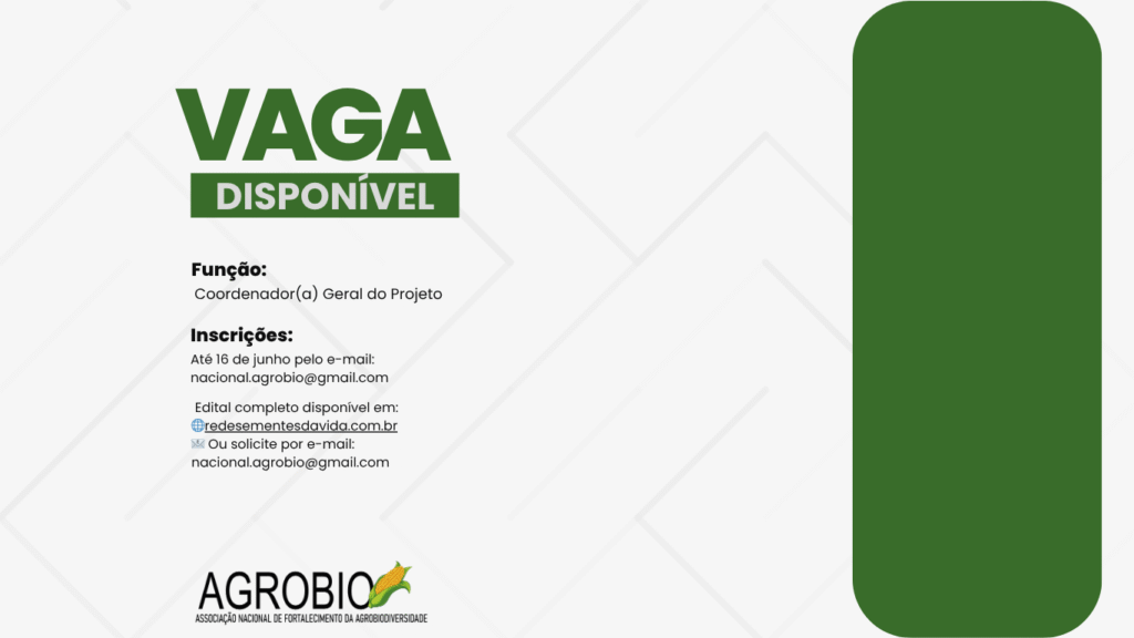 A Associação Nacional de Fortalecimento da Agrobiodiversidade (AGROBIO) está com processo seletivo aberto para a contratação de um(a) Coordenador(a) Geral para o projeto “REDES SEMENTES DA VIDA: Cultivando a Biodiversidade e Fortalecendo a Agroecologia no Brasil”.